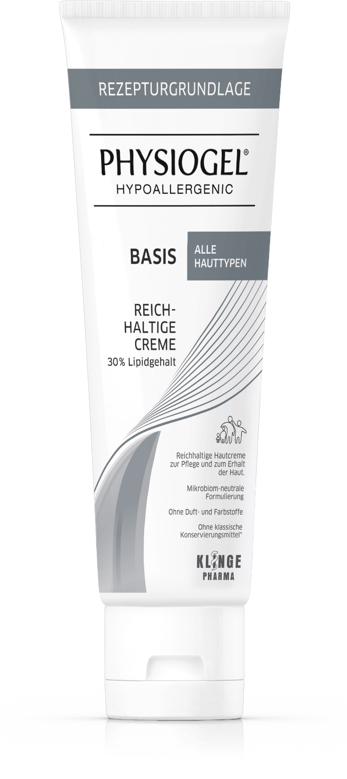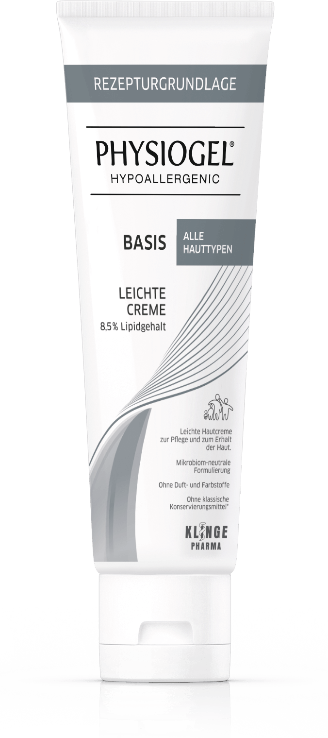 Physiogel® Basis als Rezepturgrundlage mit geprüfter galenischer Stabilität für verschiedene Wirkstoffe. Mit einzigartiger BioMimetic Technologie, mikrobiom-neutraler Formulierung, ohne Duft-, Farbstoffe und Silikone, ohne klassische Konservierungsstoffe*, ohne Emulgatoren.